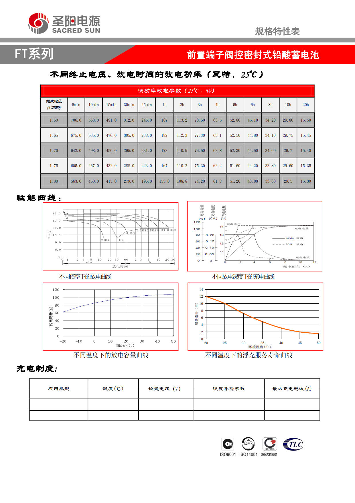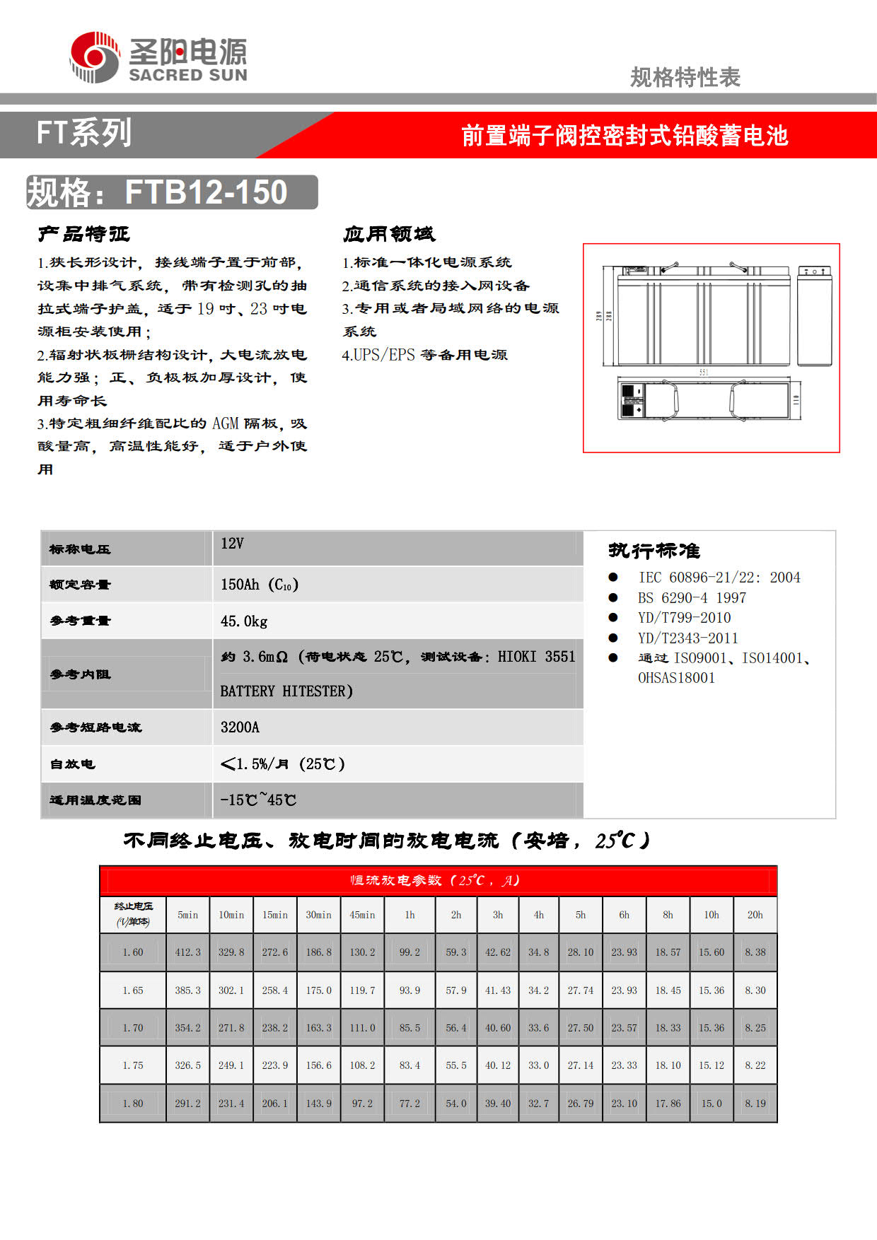 1. 容量范围:55Ah—200Ah;2. 电压等级:12V;3. 自放电小:≤1.5%/月;4. 良好的高率放电性能;5. 设计寿命长(25℃):FTA系列12年、FTB系列10年;6. 工作温度范围宽:-15℃~50℃。